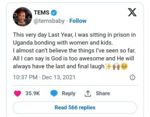 Reflecting on the anniversary of her arrest a year later, Tems expressed gratitude for the experience. “This very day last year, I was sitting in prison in Uganda bonding with women and kids. I almost can’t believe the things I’ve seen so far. All I can say is God is too awesome and He will always have the last and final laugh,” she posted on X.